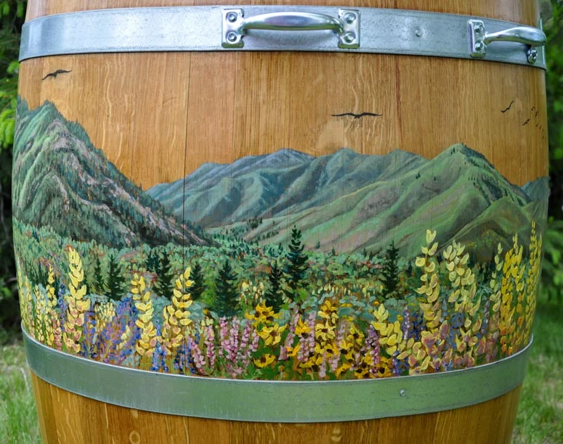 Encircling the entire girth of the barrel, I painted scenes with oil paints, including the Sun Valley Resort ski mountain, called ‘Baldy’ and surrounding vistas with wild Lupines, Penstemons, Paint Brush and Sun Flowers. Now have a spin around scenes on the barrel below. This is what our valley looks like in Spring! - G.P.L